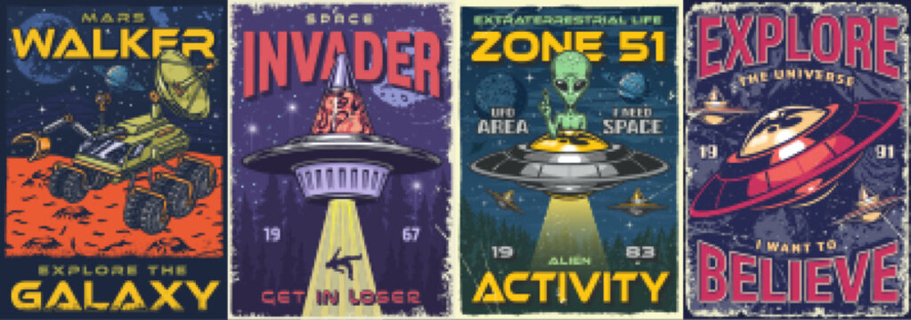 Invasion of alien spaceships under the sky at sunset. Old style film photography image.
