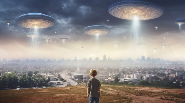 A little boy looks at the alien invasion of the city. UFO in the sky over the city. AI generation