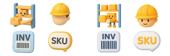 3D icon set for warehouse management, logistics, inventory control, and shipping with cute character and worker avatar