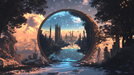 Reflecting the fantastical realm a mirror s duality of reality and dreams. illusionary mirror portal. illustration. [Mirrored Realities] | Dual Horizon | inverse skyline. Illustration