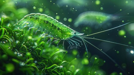 A vibrant green shrimp exploring lush aquatic vegetation in a serene underwater habitat. Generative AI