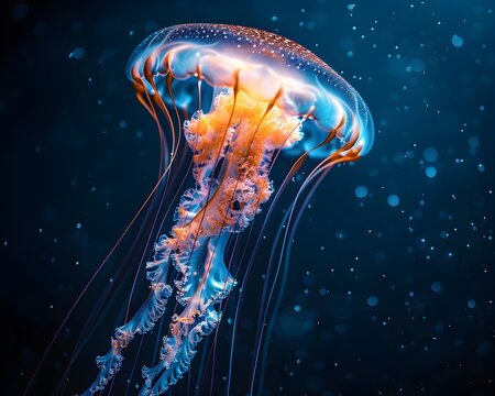 Glowing Jellyfish Floating in the Dark Depths of the Ocean Ethereal Bioluminescent Seacreature in Mysterious Underwater Dreamscape