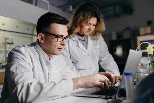 Scientist typing result of research on laptop