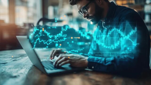 Trader looking at multiple monitors displaying bullish and bearish stock market charts, analyzing financial trends, investment opportunities, trading strategy, wide banner copy space