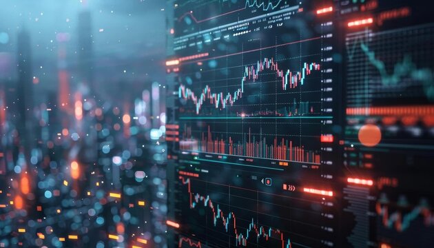 Comprehensive 3D stock market overview with detailed graphs and metrics, perfect for investment strategy sessions