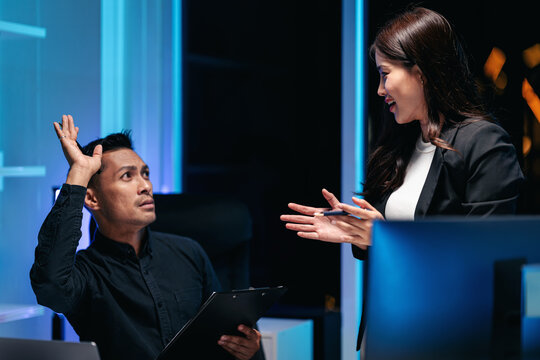 Adult business people discuss critical insights solving challenges during late night work session fostering teamwork innovative solutions in modern office