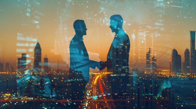 Double exposure of arab Business man handshake to his business partner with digital graphic against city night background in meeting