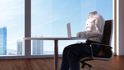 Three dimensional render of invisible person working on laptop in office
