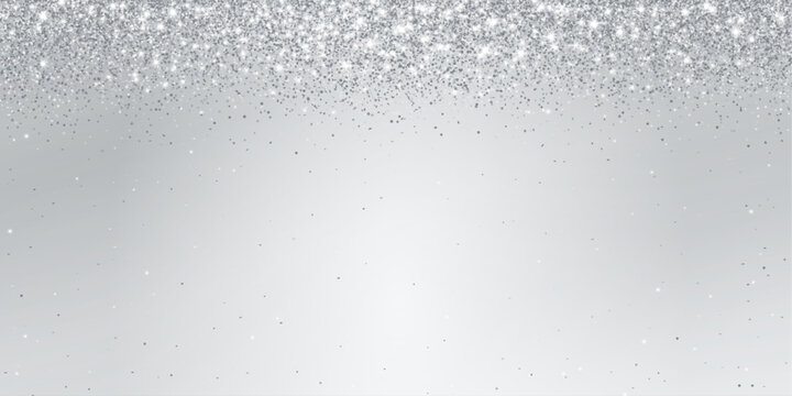 Silver glitter lights background. Sparkling glittering rain effect. Celebration backdrop for Christmas, wedding, birthday party. Luxury metallic frame, border. Vector.