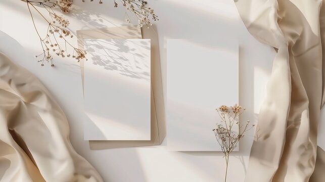 Mockup of two wedding invitation cards featuring front and back sides with stylish decor elements