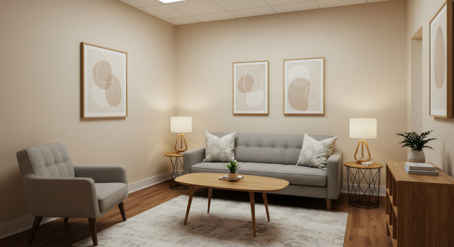 A calm and inviting hypnotherapy room with soft lighting and comfortable seating, promoting a sense of peace