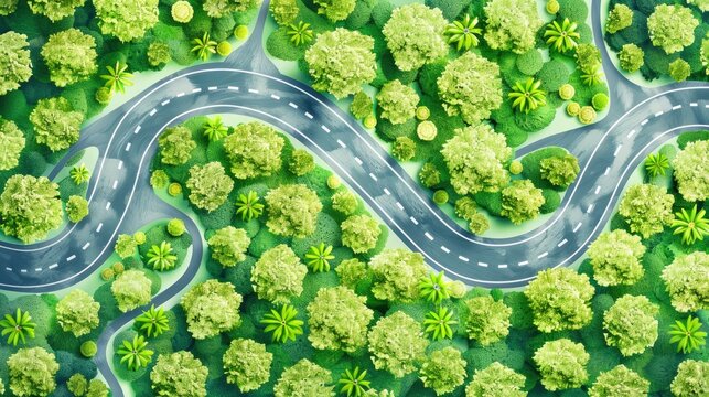 Aerial View Of A Road Winding Through Green Woods Against A Backdrop Of Blue Skies, Inviting Exploration And Adventure, Cartoon Background