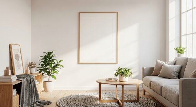 minimalist blue living room scene featuring a blank poster on the wall, inviting creativity and personalization in a tranquil home setting