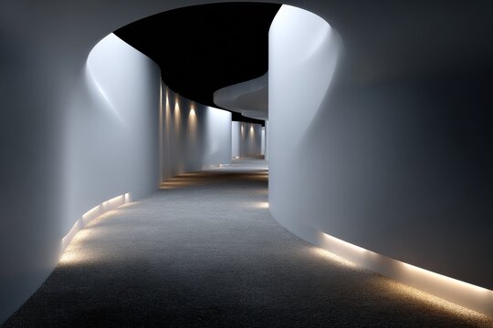 This image showcases a smoothly flowing, curved hallway lit by soft, inviting lights, creating a contemporary, tranquil atmosphere with a focus on elegant design.