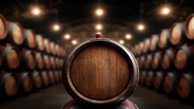 A beautifully crafted wooden barrel stands prominently in a dimly lit wine cellar, showcasing the rich textures and inviting ambiance of a traditional aging space.