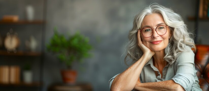 Smiling senior woman with gray hair and glasses, relaxing in a cozy living room. Indoor portrait photography with a blurred background. Warm and inviting lifestyle concept.