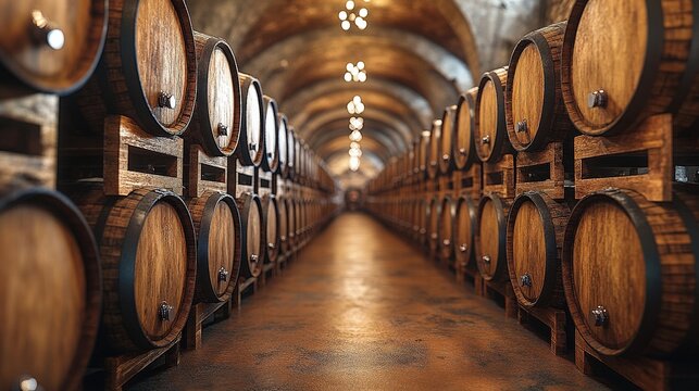 In a beautifully lit cellar, rows of polished wooden barrels create an inviting atmosphere. The stone arches and soft lighting enhance the ambiance, perfect for wine aging