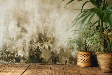 An aging craft room at home with visible wall mold, adding rustic bohemian texture. Soft, blurred background shows lush plants and a warm bamboo floor, inviting creative atmosphere.