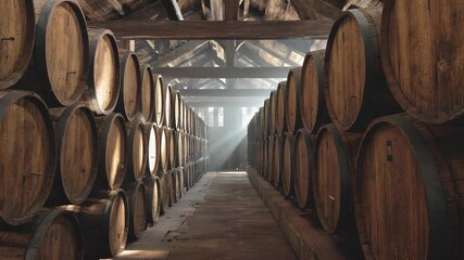 A stunning view through narrow aisles of a rickhouse reveals rows of old barrels. Dust flying in beams of sunlight, creating a serene and aromatic atmosphere