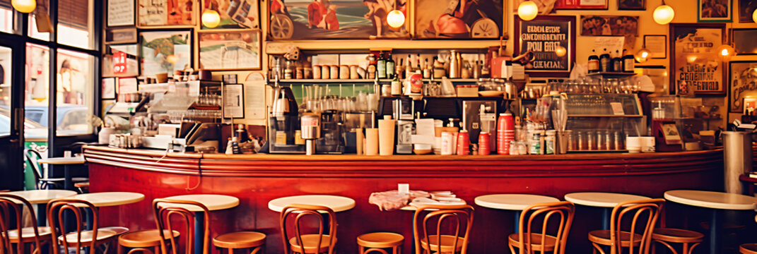 A Parisian cafe with red bar, wooden chairs, and vintage posters, evoking a warm, nostalgic, and inviting atmosphere.