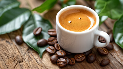A perfect cup of espresso surrounded by coffee beans. Rich colors and inviting aroma. Ideal for coffee lovers and beverage advertising purposes. AI