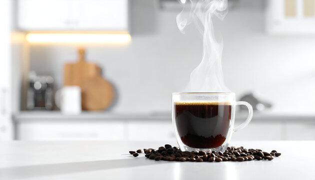 Steaming cup of black coffee sits on white countertop surrounded by coffee beans in bright, modern kitchen, creating a cozy and inviting atmosphere.