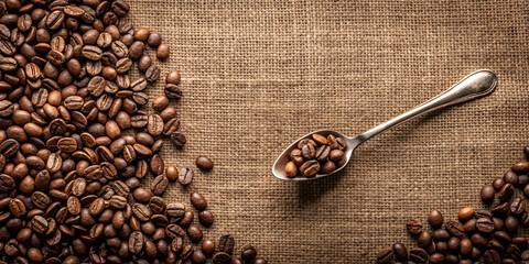 Dark roasted coffee beans cover a burlap surface, creating an inviting scene. A silver spoon holds a few beans, perfect for brewing a fresh cup of coffee