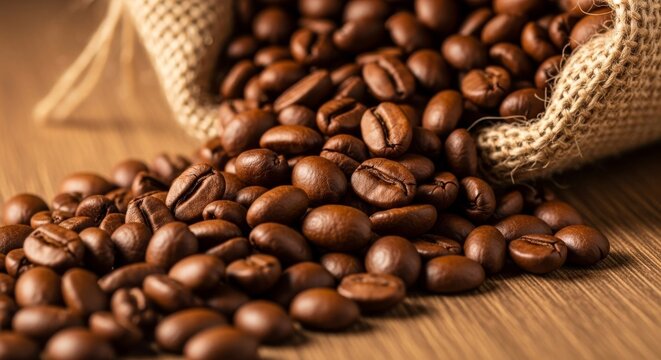 Close-up of aromatic roasted coffee beans spilling from a rustic burlap sack onto a wooden surface, highlighting freshness, texture, and the inviting warmth of premium coffee for true coffee lovers.