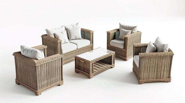Furniture placed on a white background creates an elegant and inviting space. A harmonious display of home furnishings that inspires interior design.