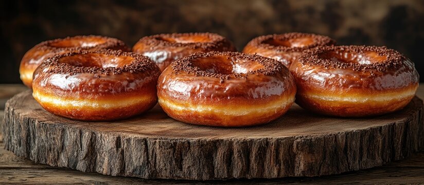 Freshly glazed donuts arranged on a rustic wooden board with a textured background for a warm, inviting food presentation.