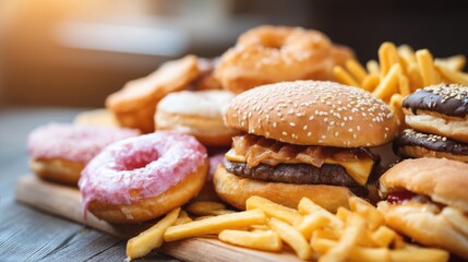 Indulgent Display of Sweet Treats Featuring Colorful Donuts, Delicious Cupcakes, Tempting Pastries, and Frosty Beverage on Rustic Wooden Background