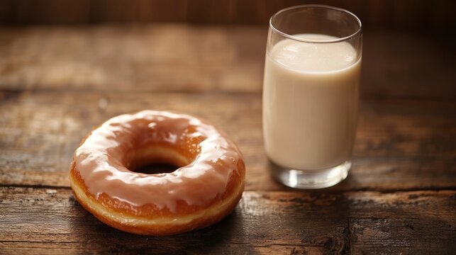 Classic Glazed Doughnut with Milk on Rustic Wooden Table