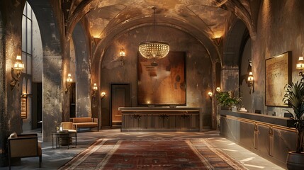 A grand, vintage hotel lobby featuring aged walls, elegant chandeliers, and stylish furnishings that evoke a luxurious, timeless atmosphere.