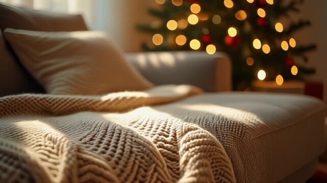 Cozy Living Room Scene with Christmas Tree and Blanket.