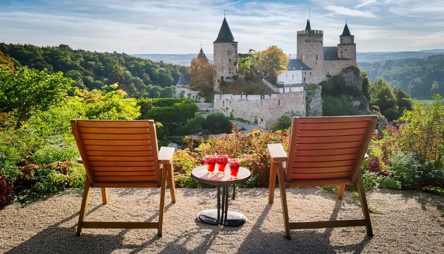 two chairs drinks with berries castle background plants and tranquil vibe