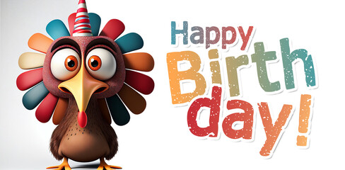 Cute birthday card/greeting/invitation, colorful illustration of turkey on white background, generative ai, digital art