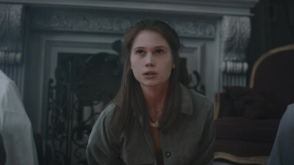Chest up shot of teenagers holding friend who writhing in their hands while being possessed by demonic spirit, she suddenly opening black eyes and pronouncing prayer indoors