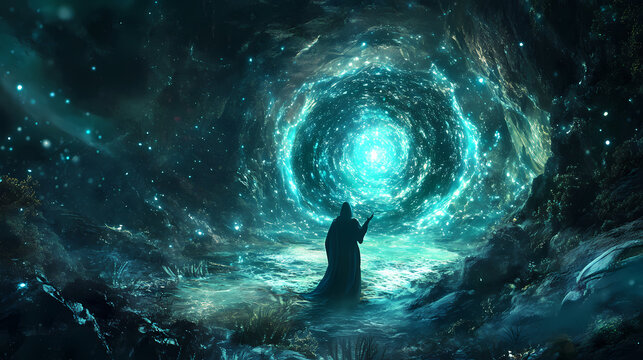 Surrealism art of an oracle performing an invocation in an underwater realm. Astral Bioluminescent Portal. Illustration