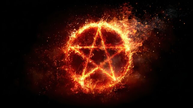 A fiery pentacle symbol engulfed in bright flames represents mysticism, inner power, and intense spiritual energy.