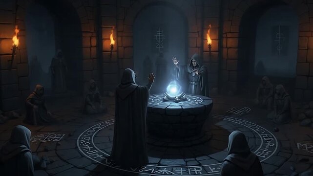 mystic ritual in stone dungeon with hooded figures and glowing orb