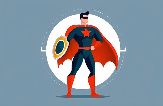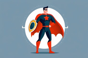 Security safety, protection or shielding insurance, privacy protect, defense from cyber attack, safeguard, guarantee or threats control concept, businessman superhero holding strong protection shield.