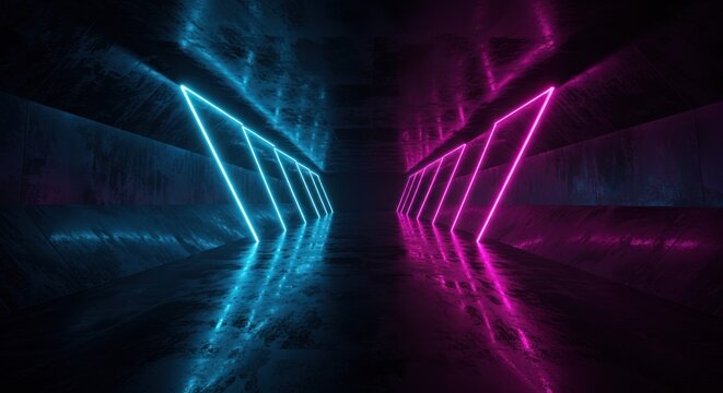 Abstract neon arrows point inward in a dark corner with textured walls.