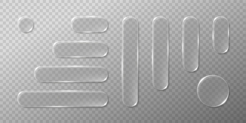 Futuristic frosted glass buttons and panels with glossy reflection and soft blur. Minimal 3D vector interface for app, website or HUD. Elegant glassmorphism UI design elements.