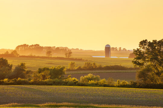 Farm and fields and trees at sunset in northeastern Iowa during the late spring