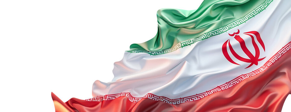 Waving Iranian flag featuring green, white, and red stripes with emblem, against a transparent background.