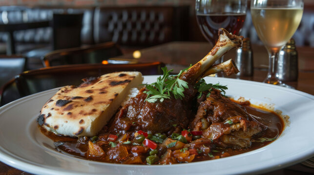 Delectable iranian lamb shank stew served with freshly baked naan bread and a glass of wine in a cozy restaurant setting