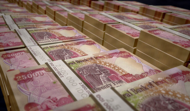 3D rendering of stacks of Iraqi dinar notes isolated on white background