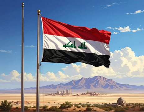 "Iraqi flag waving at sunset over mountains, symbolizing pride and resilience."