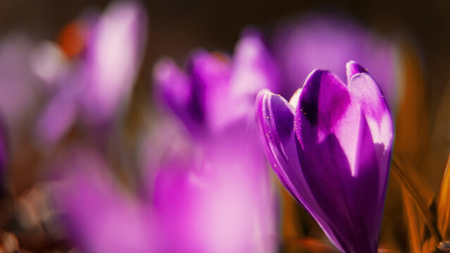 Spring background with purple Crocus iridaceae blooming in early spring. Crocus iridaceae , macro, background