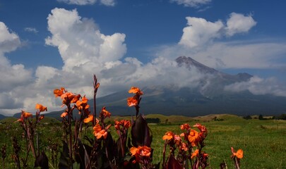spectacular view of mount taranaki  in egmont  national park across farmlands and pretty  orange gladioli on a sunny summer day  near new plymouth on west coast of new zealand's north island